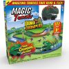 Introducing Magic Tracks Dino Chomper, the amazing racetrack that can bend and flex! Just snap the track pieces together to create your own customized speedway! Serpentine Technology allows the racetrack to form into almost any shape or pattern. Speed around any curve or bend on the track. With the Magic Tracks Dino Chomper set you can race and weave through the treacherous jungle terrain using the Dino Chomping Car! Simply CHOMP through any predators that might lurk around the corner! There is no end to the fun and exciting adventures you and your friends will have with Magic Tracks Dino Chomper!